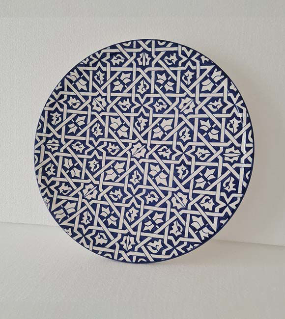 Clay unique to the Fes region is dried, cleaned, and soaked before being shaped by hand. Each plate is kiln-fired, handpainted with natural pigments, glazed for shine and durability, and fired again. This traditional process preserves the artistry and strength of Moroccan ceramics while ensuring every piece remains distinctive.