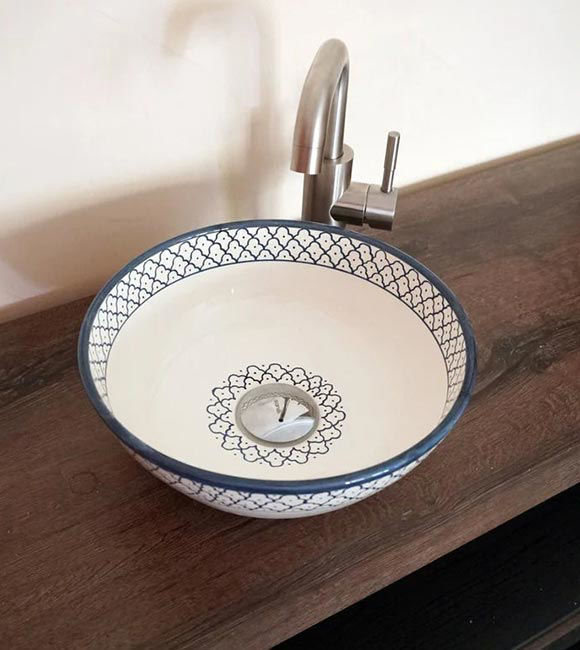Handcrafted blue & white Moroccan bathroom washbasin. Mediterranean-style vessel sink with durable ceramic design. Includes solid brass drain cap. Custom sizes.