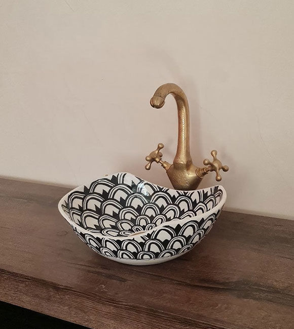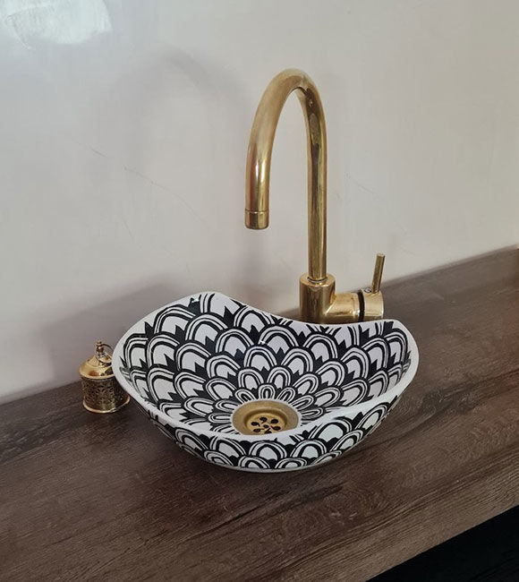 Customizable white and black Moroccan ceramic sink handmade in Fes. Luxury vessel washbasin for elegant bathroom décor with 5-year warranty.