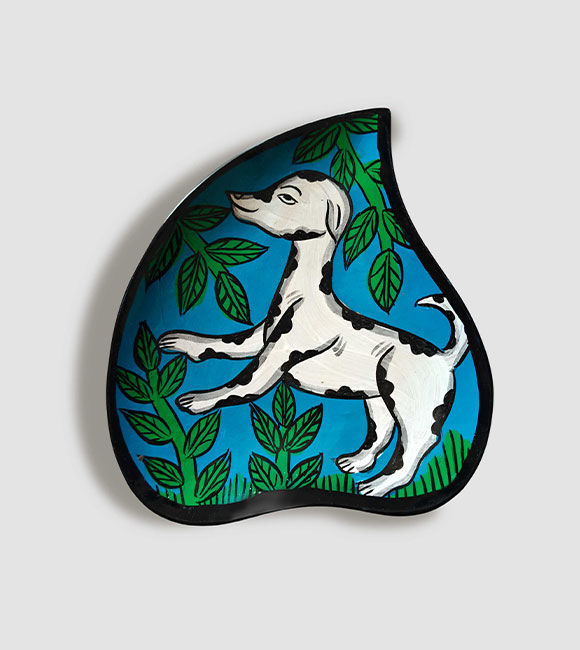 Bring art and joy to your serving moments with this hand-painted Bengal Patachitra dog snack tray. Crafted with love by rural artisans of Bengal, this vibrant piece features a playful dog surrounded by lush greenery on a striking background — a true celebration of color, culture, and craftsmanship.