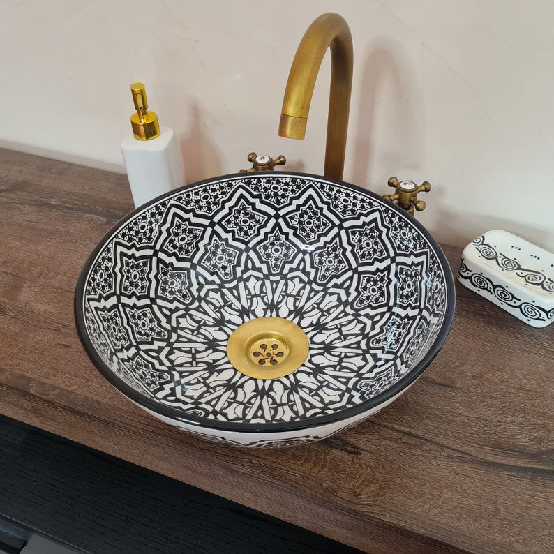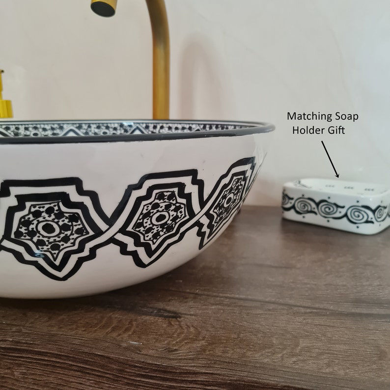 Handmade black and white Moroccan ceramic vessel sink with Mediterranean design. Durable, glazed wash basin with matching soap holder.