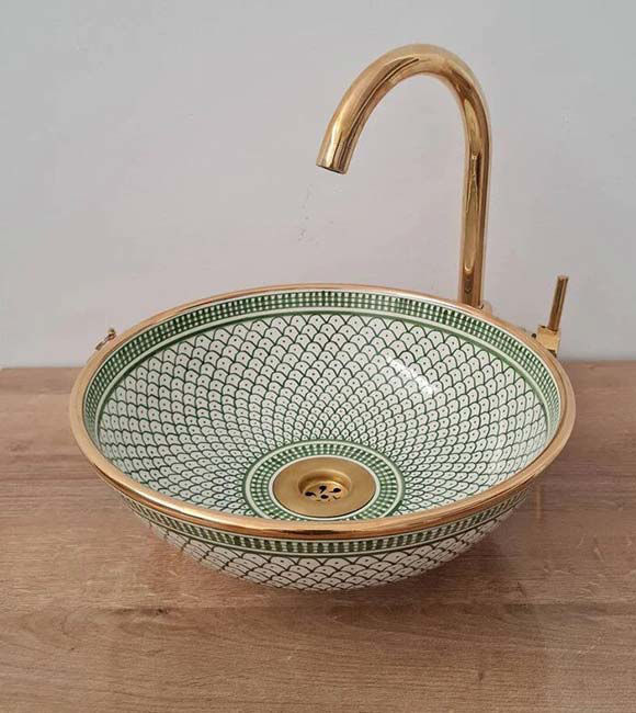 Discover our handmade Moroccan bathroom sink with 14K gold rim & fish scale design. A customizable ceramic vessel basin for luxury interiors.