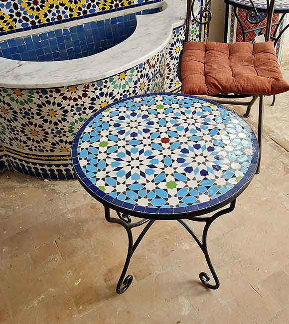 Featuring a complicated mosaic pattern, this round table showcases traditional Moroccan artistry. The vibrant blue hues and intricate hand-laid tiles reflect the rich heritage of Fes, Morocco. Whether you use it as a bistro table, patio centerpiece, or a unique indoor accent, it brings elegance and culture to your décor.