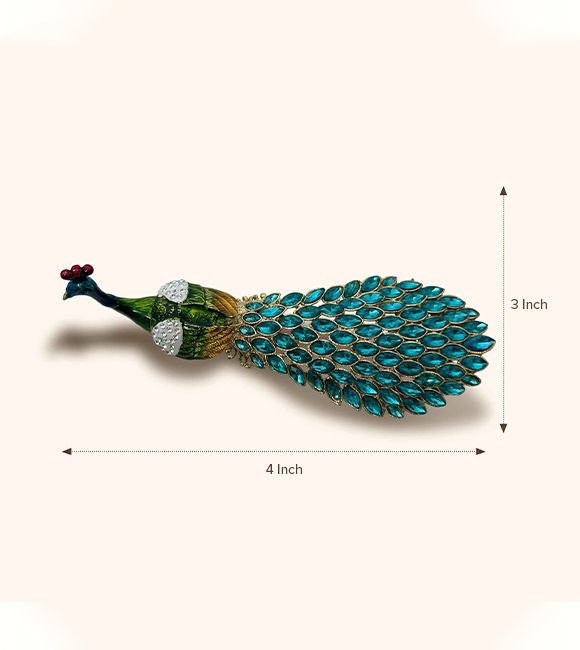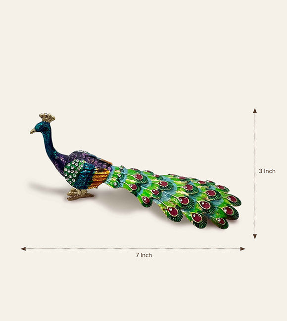 Add a touch of sparkle and artistic charm to your décor with this jeweled peacock crystal trinket box. Designed in an elegant peacock form with a long rhinestone-studded tail and enamel-style detailing, this decorative ornament doubles as a small hinged keepsake box for storing rings and tiny treasures.
