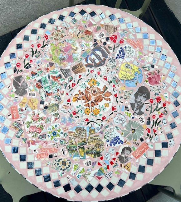 It features floral designs, an inspirational hand written message, designer mosaic roses...and even rockers like Mick Jagger, Jimi Hendrix and the Sex Pistols! Random in the best possible way:)) Suitable for indoors or outdoors. The artist's signature was carved onto a tile then fired, as shown in photos. I use top-grade extra strength swimming pool grout which renders it weatherproof and gives the piece longevity. I then apply a sealant to further protect it. Base not included but I can recommend online base suppliers. Chairs not included. It is shipped in a tailor-made wooden crate. The piece is padded with foam and shrink-wrapped for utmost protection for safe worldwide shipping.