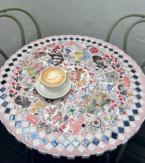 Materials: ceramic tiles, broken porcelain china, broken crockery, rock star tiles, cement tiles, pink grout, swimming pool grout, hand written message, Portugese tile, cement board