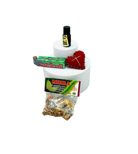 Patchouli essence oil kit with myrrh and a lucky amulet. Perfect for stress relief, rituals, and spiritual wellness. Natural, aromatic, and easy to use.