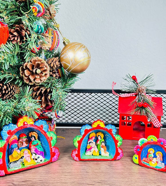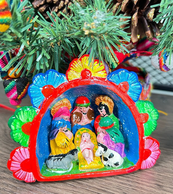 Handmade Peruvian Tocto Nativity figurines. Clay Christmas ornaments in Andean style, available in multiple sizes. Charming decor for holiday displays and gifting.