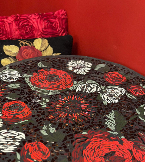 Make a bold statement with this dramatic red floral mosaic table, handcrafted by skilled artisans using a mix of ceramic tiles and gold-rimmed ornate china. The vivid red and gold roses add a touch of luxury and festivity, making this table a show-stopping centerpiece for your home, patio, or garden.