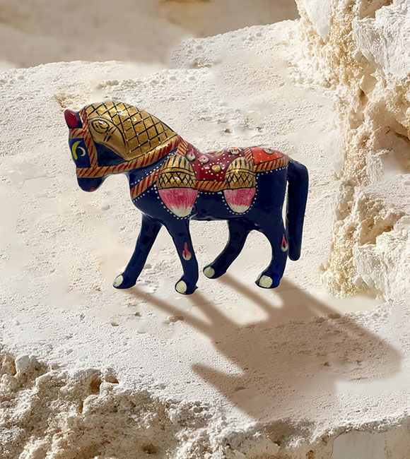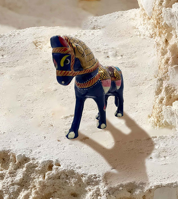 Add a pop of color and handcrafted charm to your décor with this royal blue folk art horse showpiece. This horse figurine's intricate enamel-style patterns and multicolored decorative embellishments showcase exquisite surface work and traditional craft-inspired styling.
