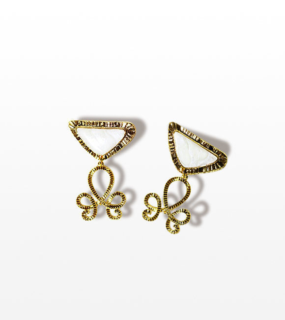 Handmade white gemstone dangler earrings in an inverted triangle design with gold-tone detailing. Elegant statement drop earrings for women.