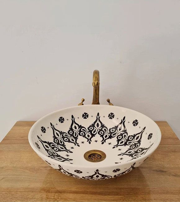 Bring timeless elegance into your home with this Black & White Moroccan Ceramic Bathroom Sink, handcrafted in Fez using traditional Moroccan techniques. With its bold patterns and minimalist palette, this mid-century modern washbasin adds sophistication and artistic character to bathrooms, kitchens, or vanity spaces.