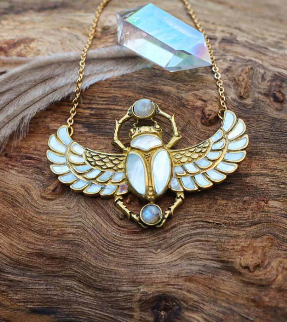 Discover the Cleopatra Scarab Necklace, a stunning Egyptian-inspired statement piece featuring Moonstone and Labradorite. Handcrafted with sustainable materials for timeless elegance.