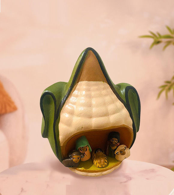 Handmade Corn Nativity Scene – Peruvian terracotta Holy Family Christmas ornament. Unique folk art piece perfect for gifts and festive decor.