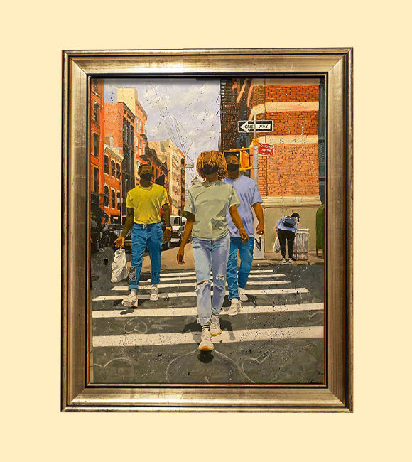 Check out "COVID-19 2020," an original acrylic painting by Durrell Hunter, a self-taught artist from the Shinnecock Nation. Measuring 36 x 48 inches, this striking artwork captures Shinnecock tribal members confidently walking through the streets of New York City amidst the COVID-19 pandemic. The scene is a testament to resilience and strength, rendered in Hunter's signature style that blends realism with abstract elements.