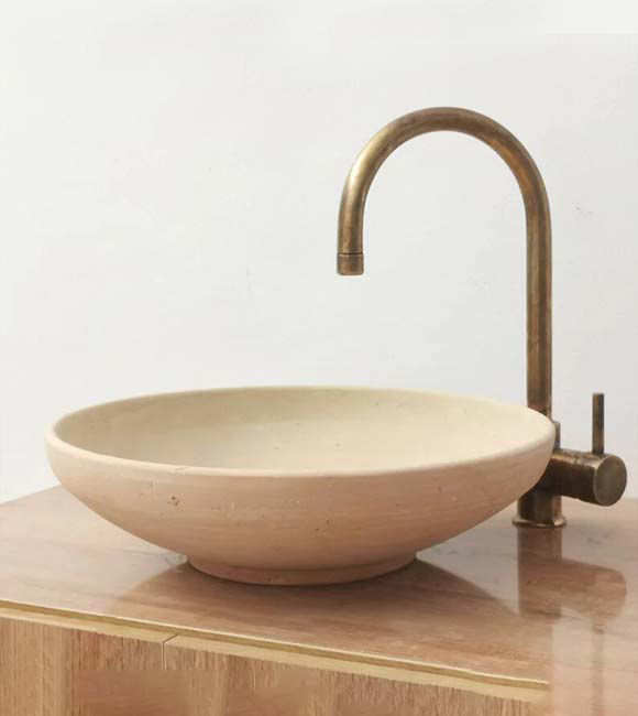 Each sink is carefully hand-pressed and hand-painted with detailed Moroccan patterns, giving it a unique charm. Its soft, neutral tones pair beautifully with a variety of surfaces—whether poured concrete, marble, tile, stone, or wood. You can even repurpose vintage furniture such as side cabinets or sewing machine tables as a washstand to create a one-of-a-kind bathroom vanity.