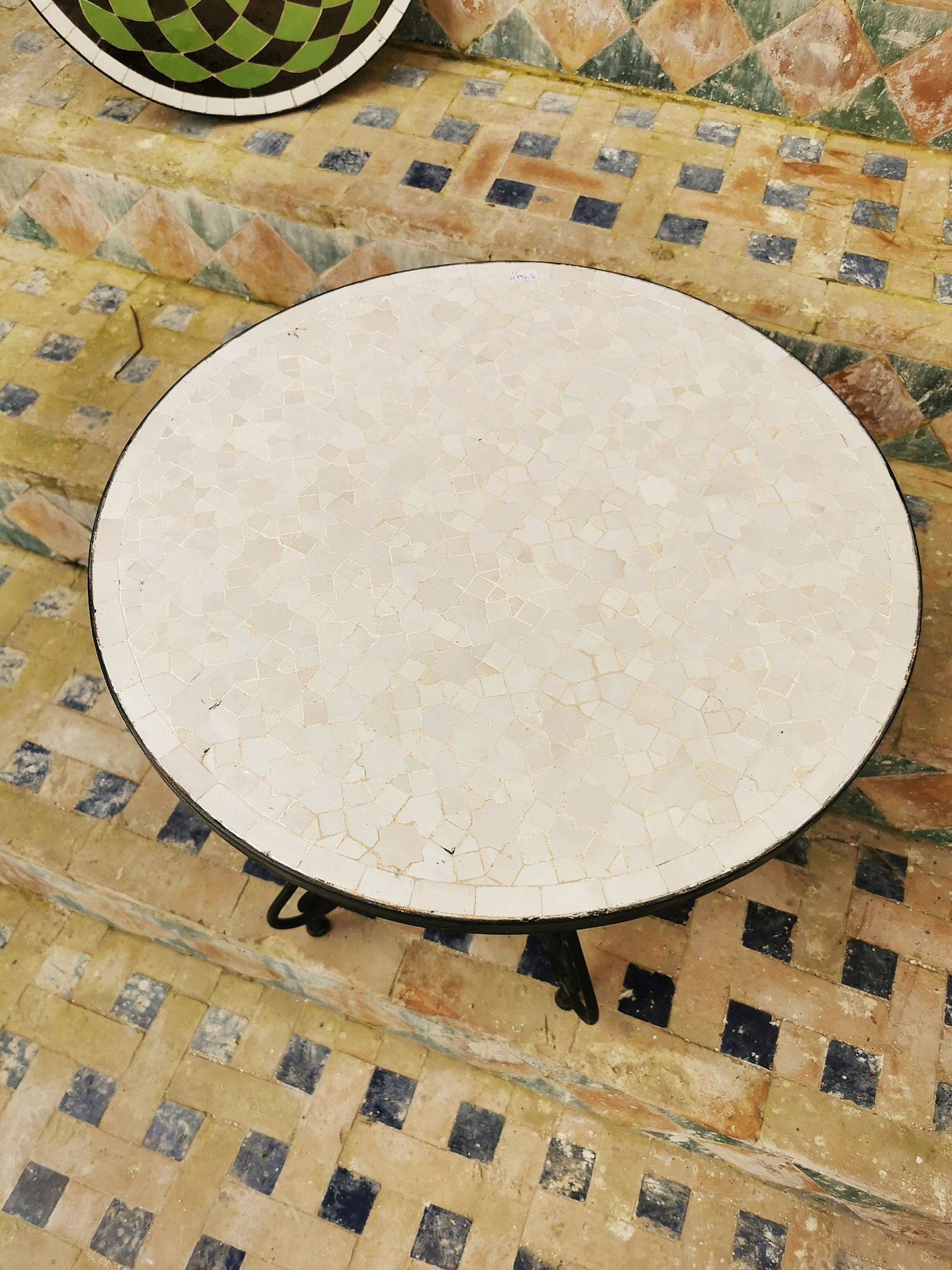 Experience the elegance of Moroccan craftsmanship with this Customizable Moroccan Mosaic Coffee Table, a stunning fusion of artistry and functionality. Handcrafted by skilled artisans in Fes, Morocco, this table showcases the intricate Zellige tilework that has adorned Moroccan homes and palaces for centuries. The delicate white mosaic pattern adds a clean, modern touch to traditional craftsmanship — making it perfect for both indoor and outdoor spaces. Whether styled as a coffee table, patio centerpiece, or artistic accent, this piece exudes timeless sophistication. Each table is made to order and can be customized in color, size, and pattern to perfectly suit your decor. Every tile is cut, glazed, and assembled by hand, reflecting generations of artistry and heritage passed down through Moroccan tradition.