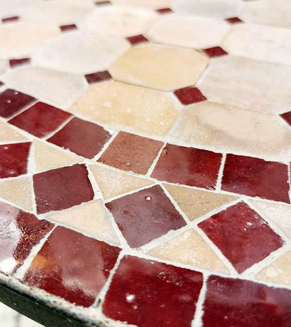 It was designed in Morocco and handcrafted by Moroccan artisans. It is crafted out of glazed clay tiles called zellige, which have been molded and proportioned in a uniquely artistic manner. It has a clear lacquer finish, which gives it a sophisticated appearance.