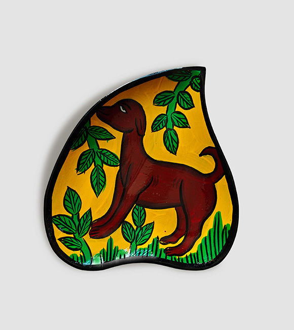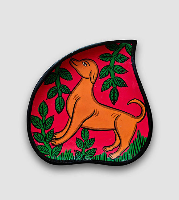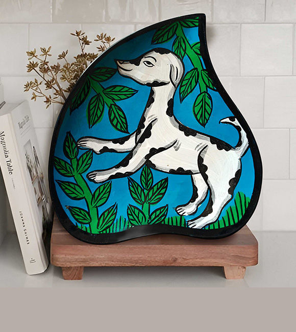 Bring art and joy to your serving moments with this hand-painted Bengal Patachitra dog snack tray. Crafted with love by rural artisans of Bengal, this vibrant piece features a playful dog surrounded by lush greenery on a striking background — a true celebration of color, culture, and craftsmanship.