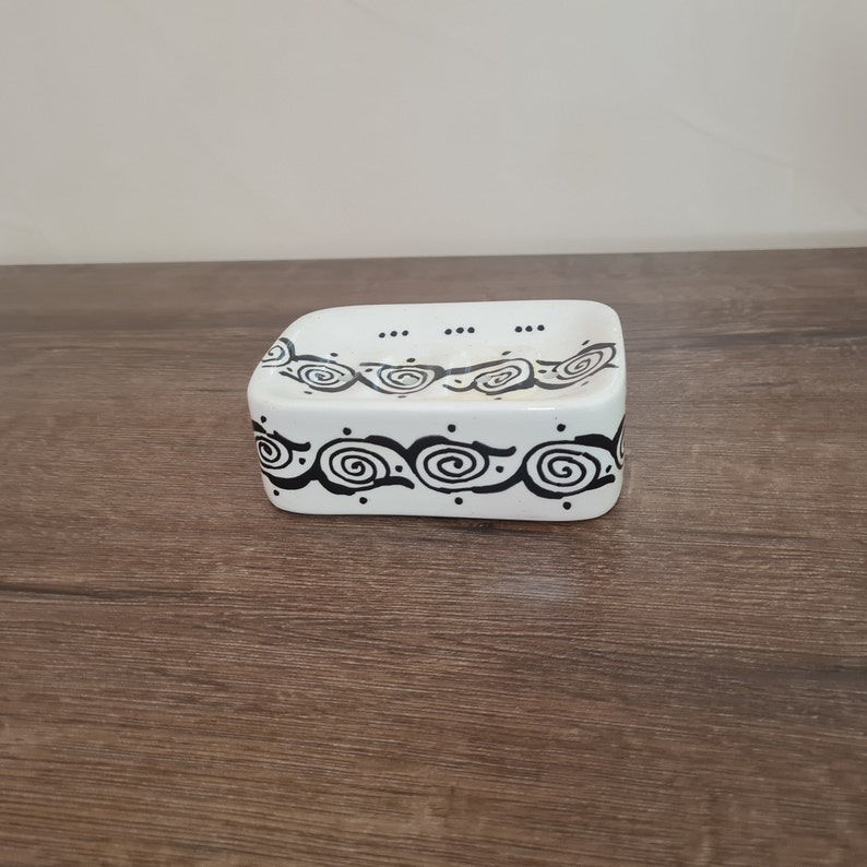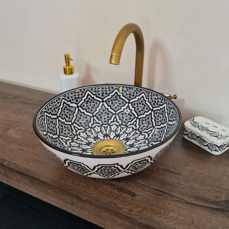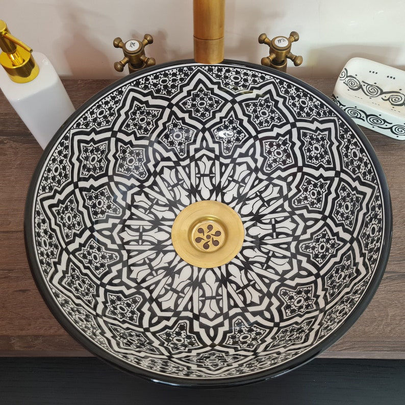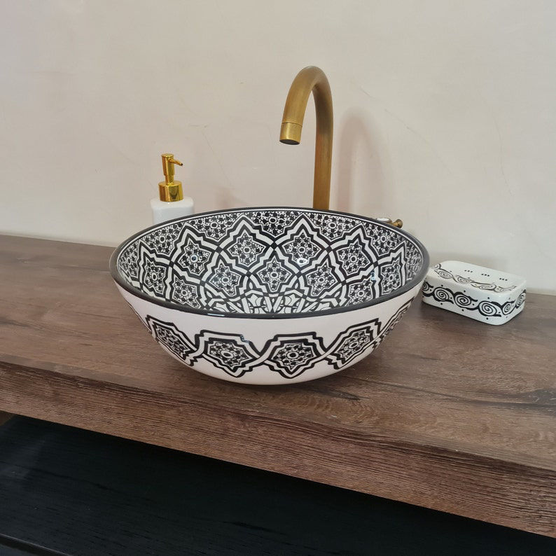 Handmade black and white Moroccan ceramic vessel sink with Mediterranean design. Durable, glazed wash basin with matching soap holder.