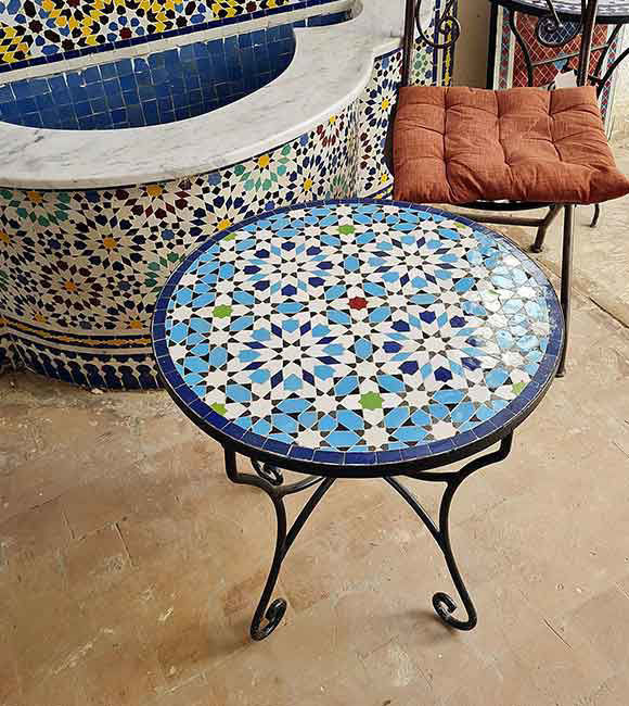 Featuring a complicated mosaic pattern, this round table showcases traditional Moroccan artistry. The vibrant blue hues and intricate hand-laid tiles reflect the rich heritage of Fes, Morocco. Whether you use it as a bistro table, patio centerpiece, or a unique indoor accent, it brings elegance and culture to your décor.