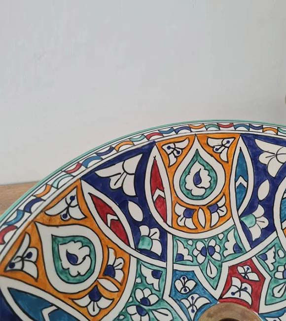 Each ceramic sink is handmade and hand-painted by skilled artisans in Fez. Its detailed patterns and rich hues make it a statement piece that works perfectly as a vanity sink, countertop basin, or even a drop-in under-mount sink.