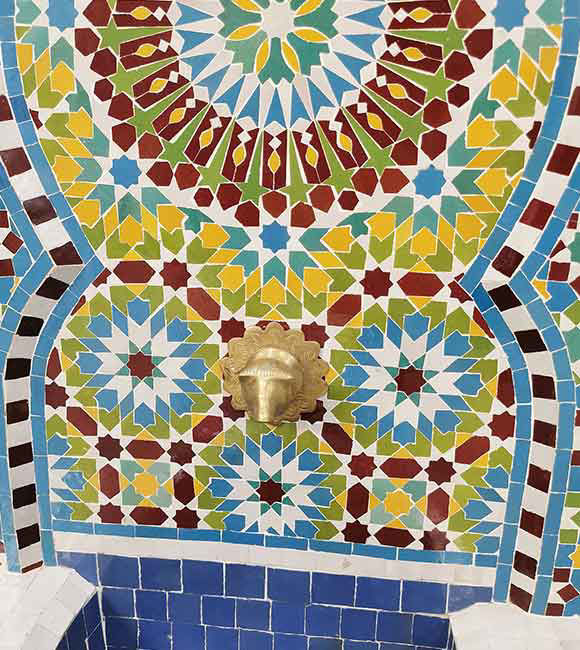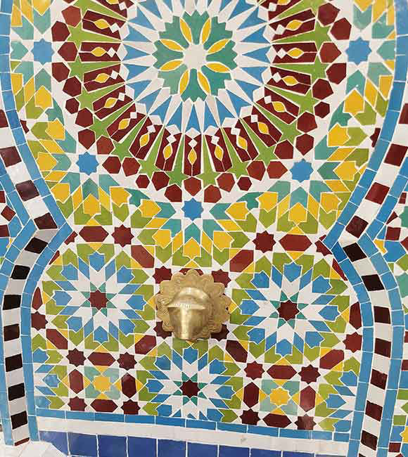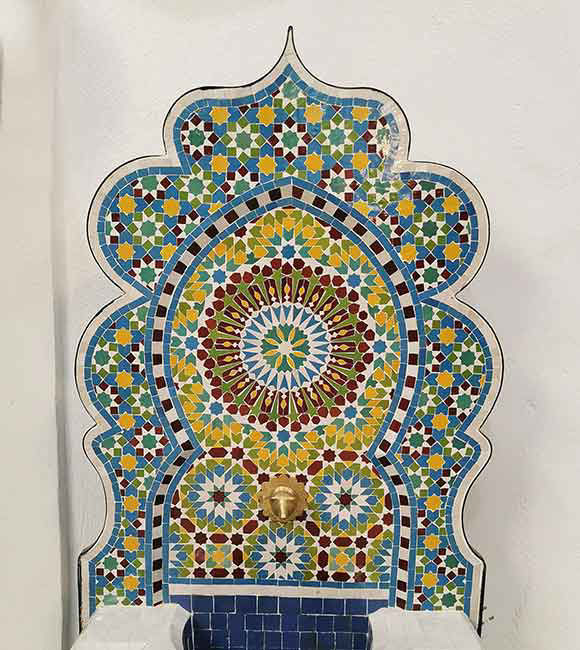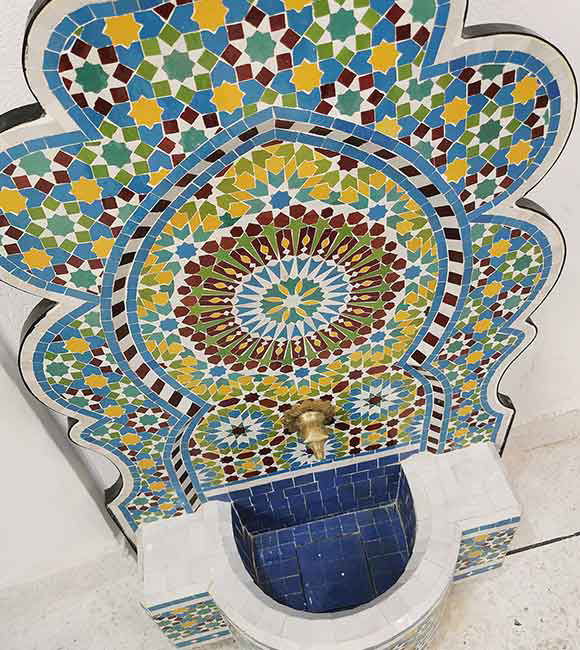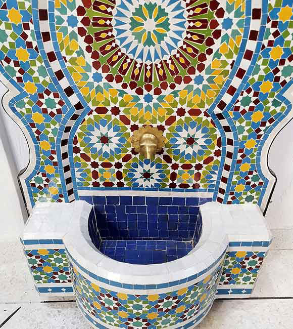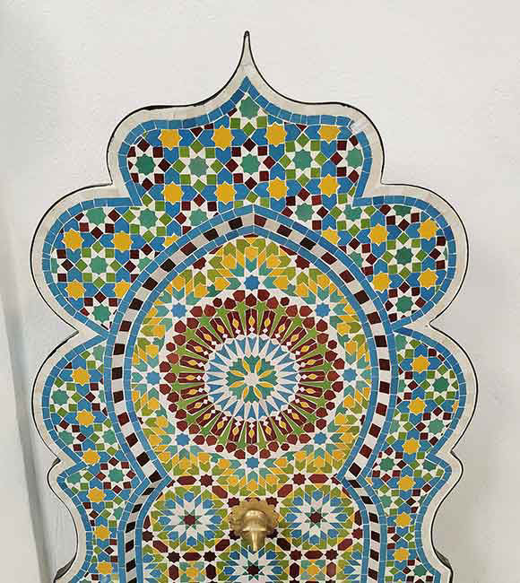 Handmade Moroccan mosaic wall fountain for gardens or patios. Rustic, artistic, and luxurious — a perfect indoor-outdoor water feature.