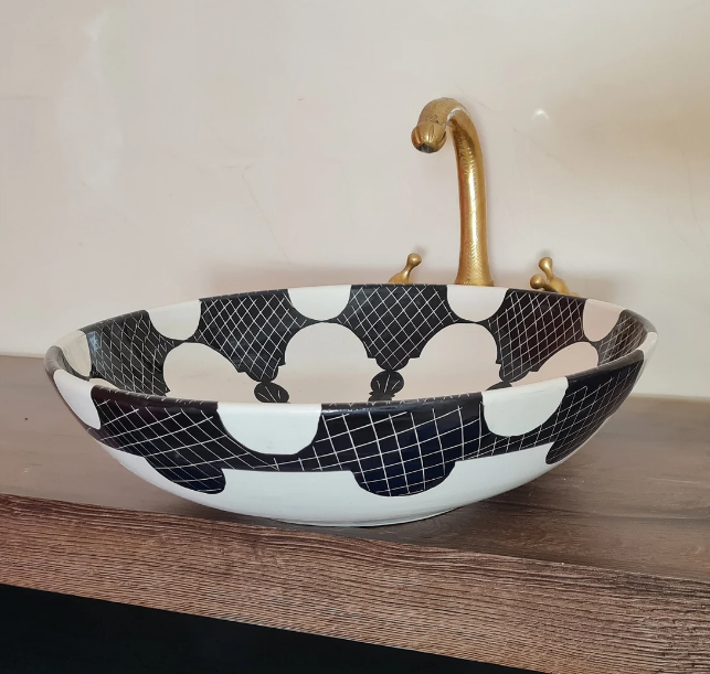 Bring timeless Moroccan artistry into your home with this Customizable Ceramic Vessel Sink. Handcrafted and hand-painted by skilled artisans in Fez, Morocco, each sink carries unique patterns, bold colors, and traditional detailing that reflect centuries of craftsmanship. Perfect for bathrooms or kitchens, this versatile basin can be installed as an over-counter, countertop, or drop-in undermount sink.