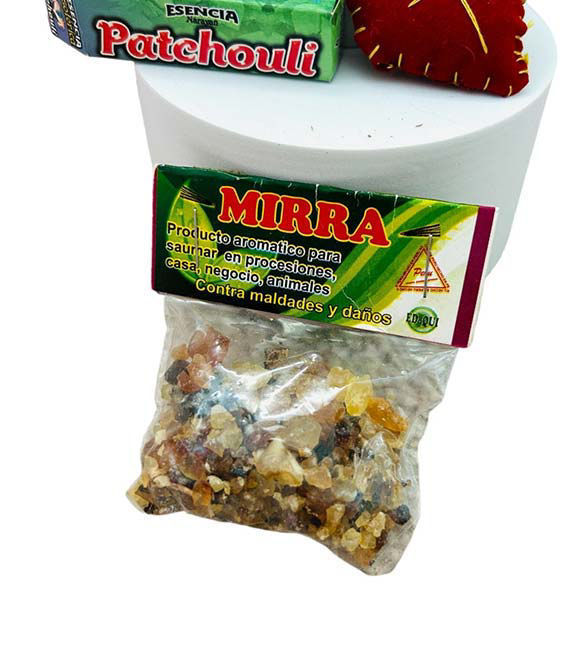 Patchouli essence oil kit with myrrh and a lucky amulet. Perfect for stress relief, rituals, and spiritual wellness. Natural, aromatic, and easy to use.