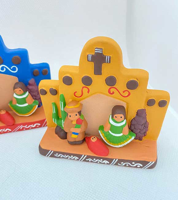 Bring a piece of Peruvian heritage into your home with this beautifully handcrafted Alamo Nativity Scene. Made by skilled Peruvian artisans, this ceramic church ornament showcases the Holy Family inside the iconic Alamo, symbolizing both faith and cultural history.