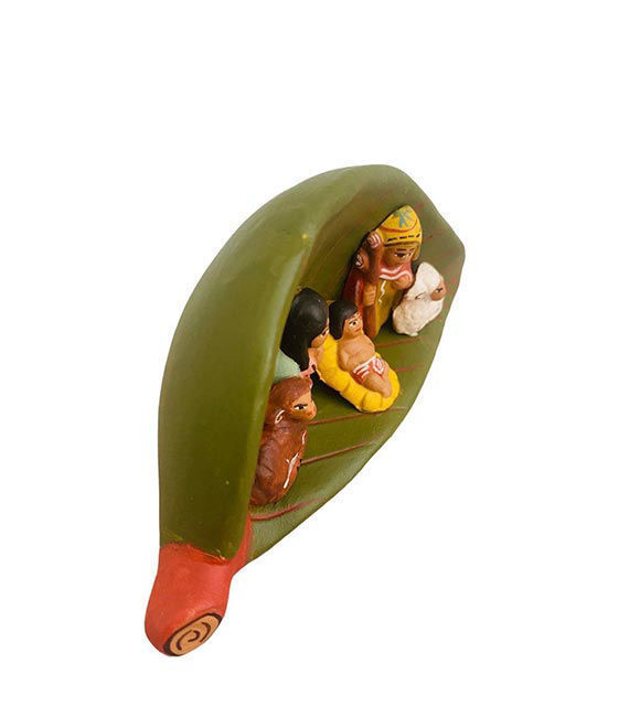 Shop vintage nativity in leaf décor handcrafted by Peruvian artisans. Hand-painted Holy Family clay ornament perfect for Christmas décor or gifting.